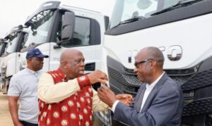 Oito camiões, dos quais cinco cisternas para o abastecimento de água potável e três basculantes para a recolha de resíduos...