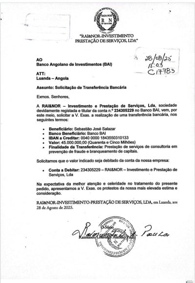A operação foi mascarada como um contrato de “consultoria em prevenção de fraude e branqueamento de capitais”, através da empresa RAI&NOR – Investimento e Prestação de Serviços, Lda, que solicitou ao Banco Angolano de Investimentos (BAI) a transferência de 45 milhões de kwanzas para a conta de Salazar.