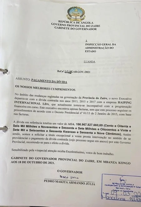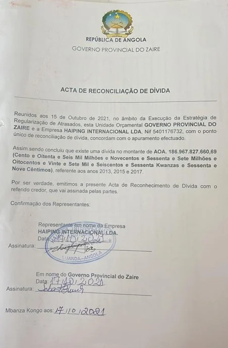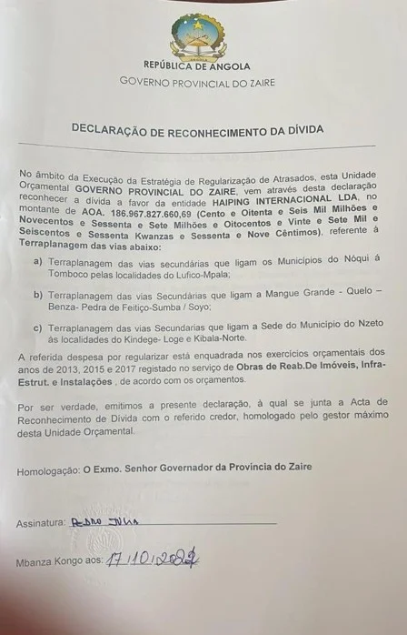 Segundo consta na declaração de reconhecimento da dívida assinada pelo antigo governador do Zaíre, Pedro Makita, aos 17 de outubro de 2022, a dívida bilionária que a empresa HAIPING INTERNACIONAL, LDA cobra ao estado angolano, é referente a terraplanagem das vias secunndárias que ligam os municípios do NOQUI – Tomboco, localidade de Mangue Grande – município do Quelo e Benza-Pedra de Feitiço – Sumba no Soyo, vias secundárias que ligam o Município sede do Nzeto às localidades do Kindege -Loge e Kibala do Norte. Dívida é resultante dos exercícios governativos dos anos 2013, 2015 e 2017 registados no serviço de obras de reabilitação de imóveis, infra-estruturas e instalações.
