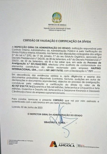 Para o pagamento da dívida pública falsa, Pedro Makita, Ângela Diogo e o cidadão chinês ZHANG HAIPING ,terão contado com o beneplácito do actual presidente do Tribunal de Contas, Sebastião Domingos Gunza, enquanto Inspector-Geral do IGAE, certificou a primeira parcela da dívida no valor 43.757.218.719,16 ( Quarenta e três mil milhões, setecentos e cinquenta e sete milhões, duzentos e dezoito mil , setecentos e dezanove kwanzas e dezsseis cêntimos), a favor da empresa HAIPING INTERNACIONAL, LDA com NIF 5401176732, fazendo recurso ao processo nº 031/IGAE/2023, da averiguação feita supostamente por técnicos do IGAE, todavia a fonte informou a NSISA REFLEXÕES que, na província do Zaíre não fez-se trabalho de averiguação destas obras e não seria possível, porque a empresa em referência nunca celebrou contrato com o governo provincial e nem prestou serviço para obras de terraplanagem.